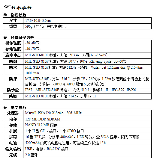 便攜式數(shù)據(jù)讀取裝置重596g,抗振及耐高、低溫標準符合軍用技術(shù)規(guī)范。內(nèi)置一塊5200mAh的電池組,可連續(xù)工作長達15h。集成了RS232C接口和USB端口。插槽防風、雨以及灰塵。支持藍牙,無線局域網(wǎng),GPS卡。