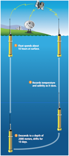 隨洋流移動,通過改變體積實(shí)現(xiàn)自主沉降,最深可下至2000米深度,進(jìn)行整個2000米尺度的剖面數(shù)據(jù)記錄,待到下次懸浮于海面上時通過衛(wèi)星傳輸一次剖面的數(shù)據(jù),隨后再次進(jìn)入下沉的循環(huán)。(過程如下圖所示)